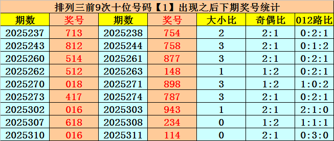 十位号码:十位上期开出偶数、小 号、1路号码:1,历史上十位号码1共开出733期,上一次出咫尺第2025310期,上期奖号为重号。 在十位前9次出现号码1后,其下期奖号区别开出:5-5-7-4-9-8-4-3-1,其中奖号个数大小比是5:4,012路比是2:4:3,奇偶比是6:3。 本期十位看好出现偶数号码,堤防号码8。