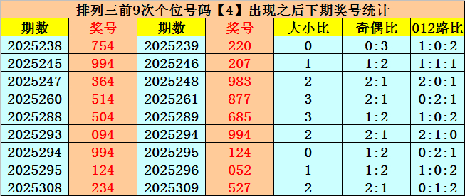 个位号码:上期奖号为小 号、偶数、1路号码:4,历史上个位号码4共开出824期,前一次出咫尺第2025308期,上期遗漏2期再出。 个位前9次开出号码4时,该位下期奖号区别为:0-7-3-7-5-4-4-2-7,其中号码个数大小比是4:5,012路比是2:5:2,奇偶比是5:4。 本期个位堤防开出1路奖号,胆码看好4。