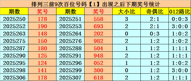 百位号码:百位上期奖号为1路、偶数、小 号:1,历史上百位号码1共开出708期,前一次开出期数在第2025306期,上期奖号隔4期再次开出。 在百位前9次出现号码1之后,下期百位区别开出奖号:5-6-2-9-5-9-0-3-6,其中开出号码个数奇偶比是5:4,大小比是6:3,012路比是6:0:3。 本期百位要点关爱偶数号码,参考号码6。